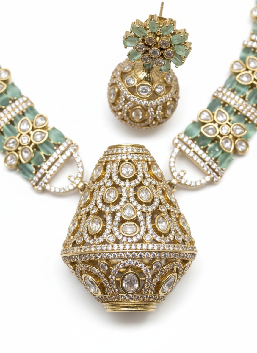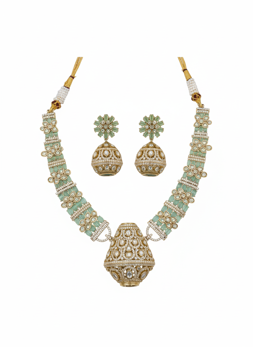 The set includes floral mint-green stud earrings and is a true heirloom statement piece, perfect for bridal wear and grand celebrations.