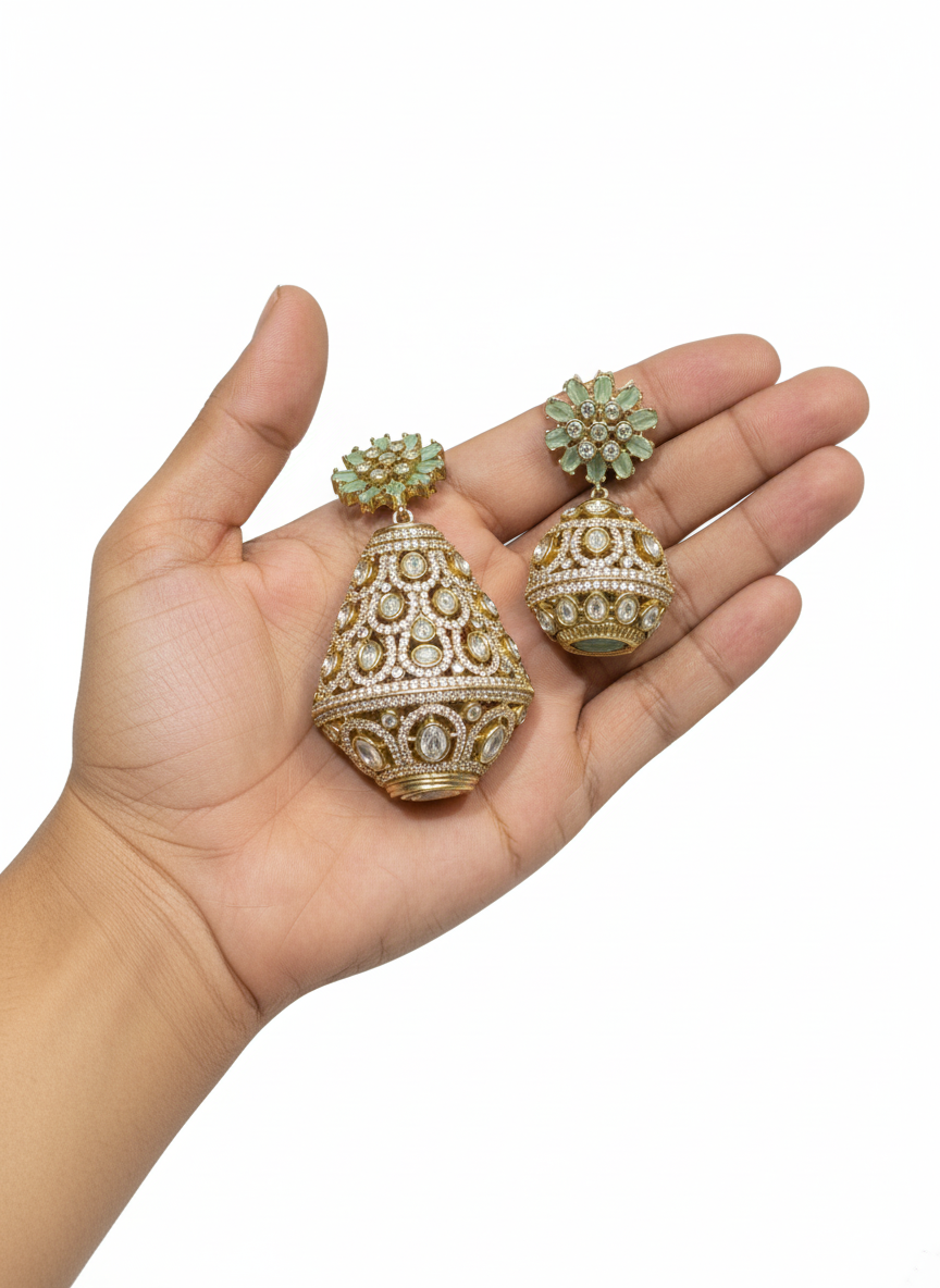 - Intricate Polki/Kundan-style clear stone work.